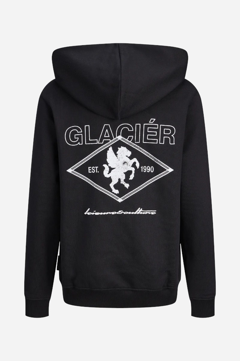 En sort hoodie med et clean look foran og et fedt, iøjnefaldende rygprint, der giver ekstra kant. Den er lavet i en blød og komfortabel sweatkvalitet med justerbar hætte og ribkanter for den perfekte pasform. Ideel til både hverdagsbrug og et mere street-inspireret outfit.