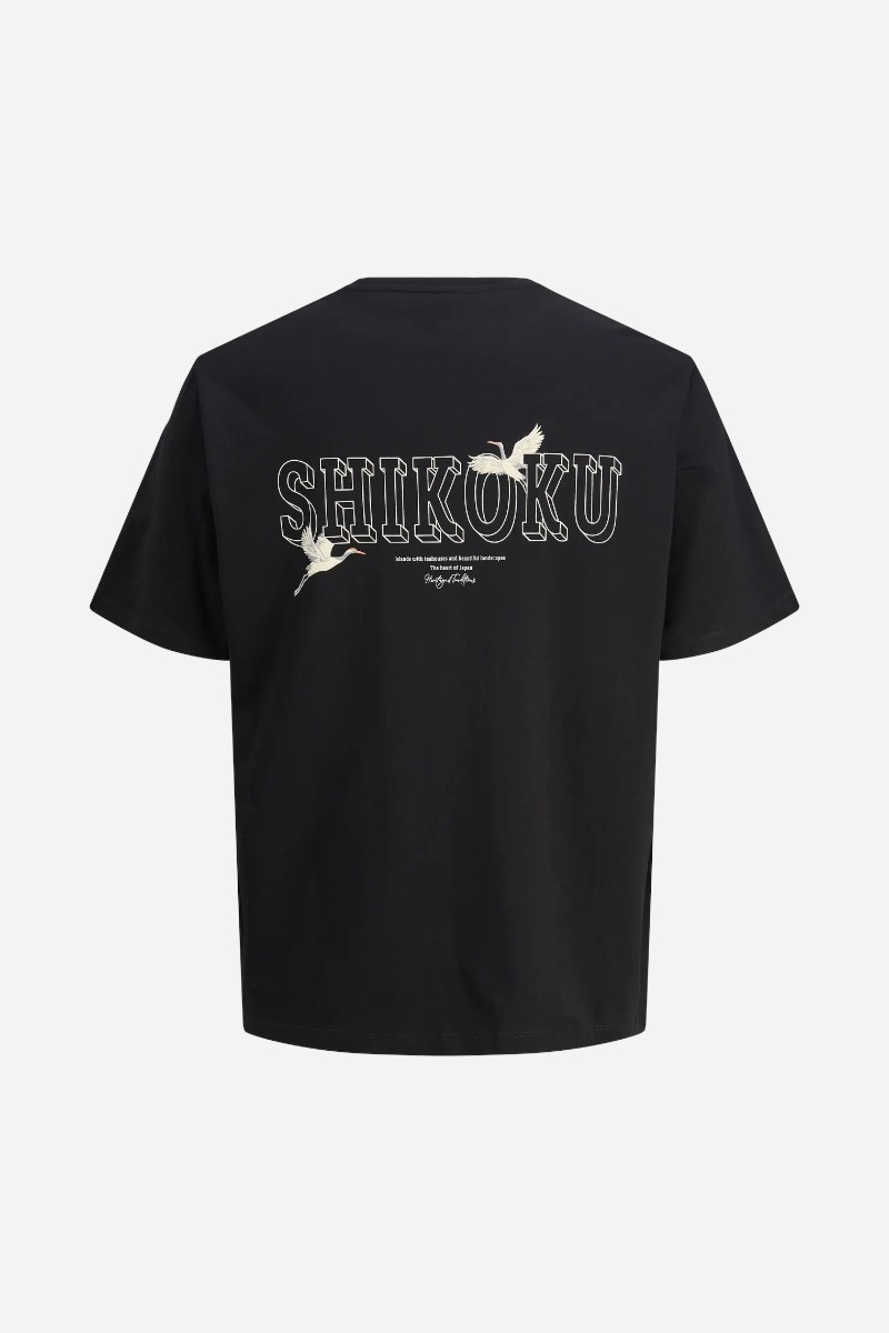 En sort tee med et clean frontlook og et markant rygprint, der giver et moderne street-inspireret udtryk. Den bløde bomuld gør den super komfortabel, og den tidløse sorte farve gør den nem at style til alle outfits.